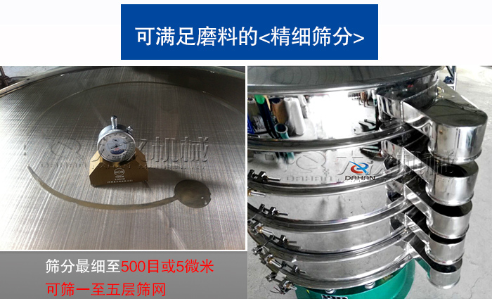 超聲波振動篩可滿足顆粒、粉末、粘液一定范圍內均可篩選。篩分細至500目或0.028mm, 過濾小可至5微米。分級篩選,可篩一至五層篩網,能同時進行二至六個等級的分選或過濾。所以對于4目—500目之間的磨料能輕松進行精細篩分。