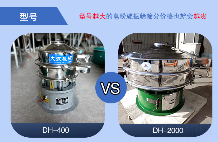皂粉旋振篩的型號可分為DH-400、DH-600、DH-800、DH-1000、DH-1200、DH-1500、DH-1800、DH-2000等八種標準型號,型號差異主要是根據(jù)篩機直徑?jīng)Q定,直徑越大型號越大,隨之每小時篩分的皂粉產(chǎn)量就越大,型號越大的皂粉旋振篩篩分價格也就會越貴。