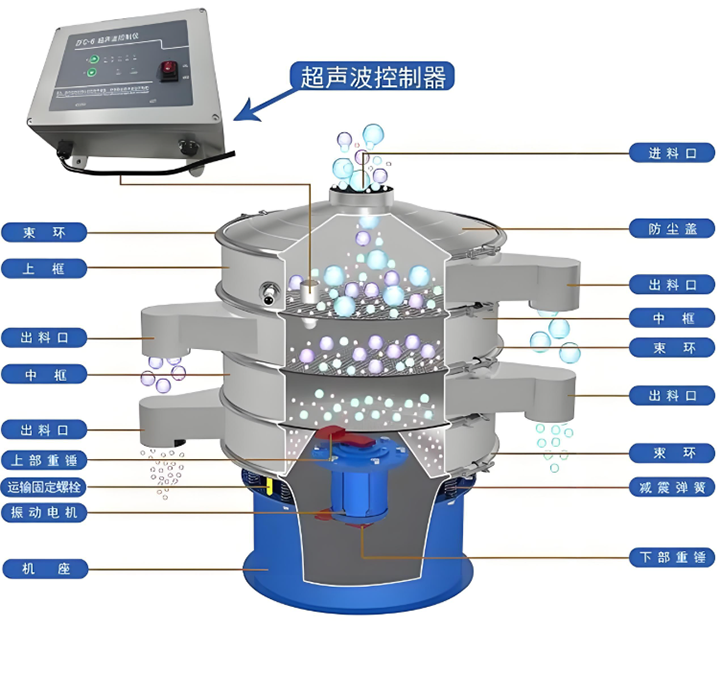 超聲波振動篩廠家生產的通用結構是振動源、篩箱、篩網、超聲波系統及減震裝置等。振動源為物料輸送供能;篩箱是物料篩分核心空間,內部裝有200目或500目等不同目數的篩網,篩網通過專用張緊裝置固定以保穩定;超聲波系統含超聲波發生器和換能器,換能器可破物料團聚、防堵網;減震裝置裝于設備底部,能吸收設備運行振動,減少對地面及周邊設備影響,同時保障設備穩定運行。我廠的超聲波發生器分為內置式和外置式,并且我廠的超聲波振動篩有法蘭式,能夠使物料輸送無泄漏。